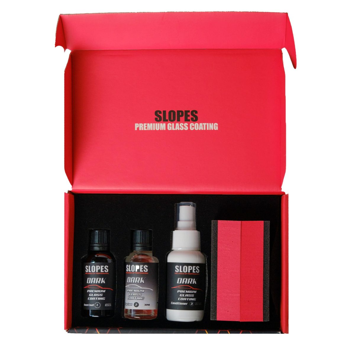 Slopes Dark Base Coat 1 ve Dark Top Coat 2 İki kat cam  kaplaması, mükemmel ve genişletilmiş dayanıklılık ile araç Boyasını Ve Verniğini  korur, son kat parlaklığını, su iticiliğini ve kirlenme önleme özelliklerini iyileştirme üstün performanslarıyla öne çıkan üst düzey Seramik  kaplamadır.